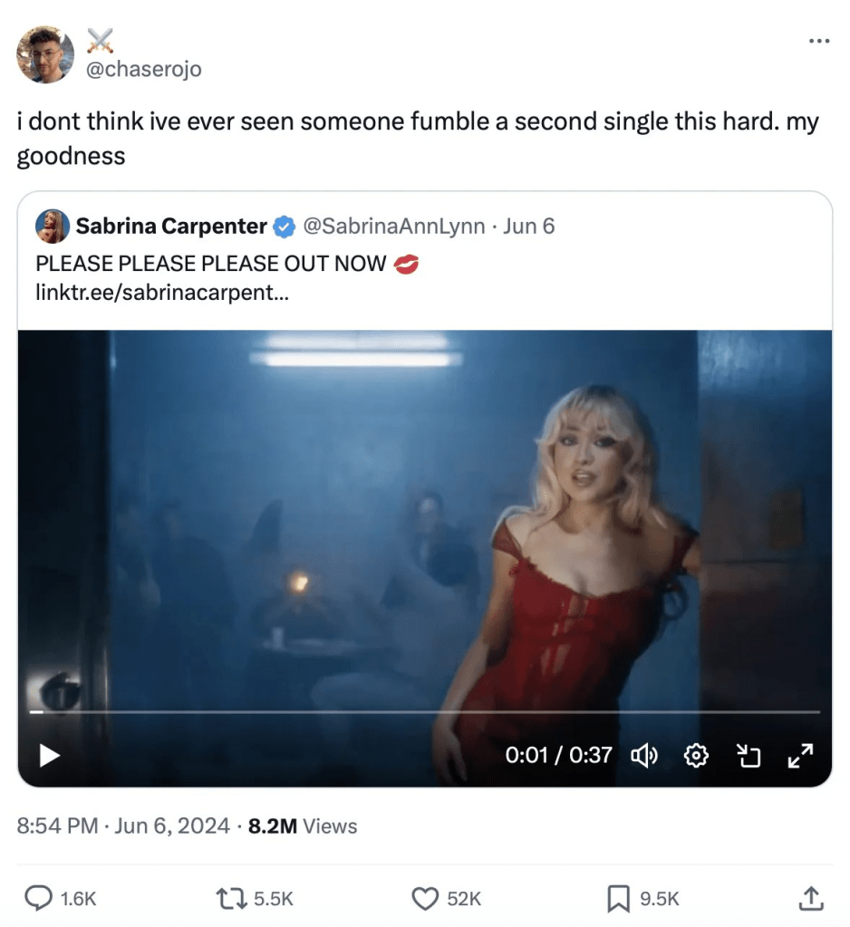 “i don’t think i’ve ever seen someone fumble a second single this hard. my goodness.” those were the exact words a (very mistaken) social media user posted online when ‘please please please’ was first released.